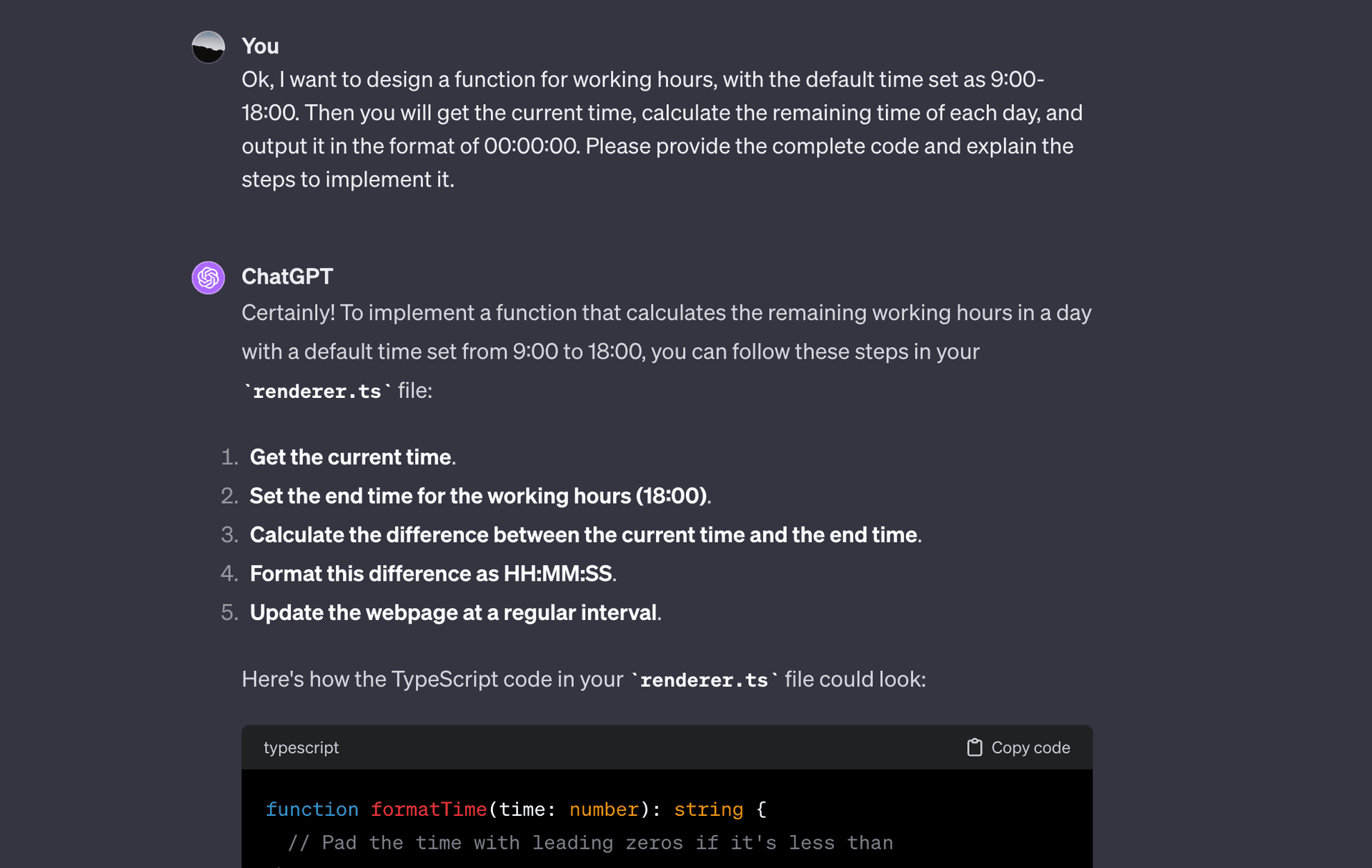 For instance, if you don't know how to start with the initial framework, you can paste your requirements and the framework's code into ChatGPT, and let it tell you how to solve it. Below is the implementation process for a requirement to display local time: