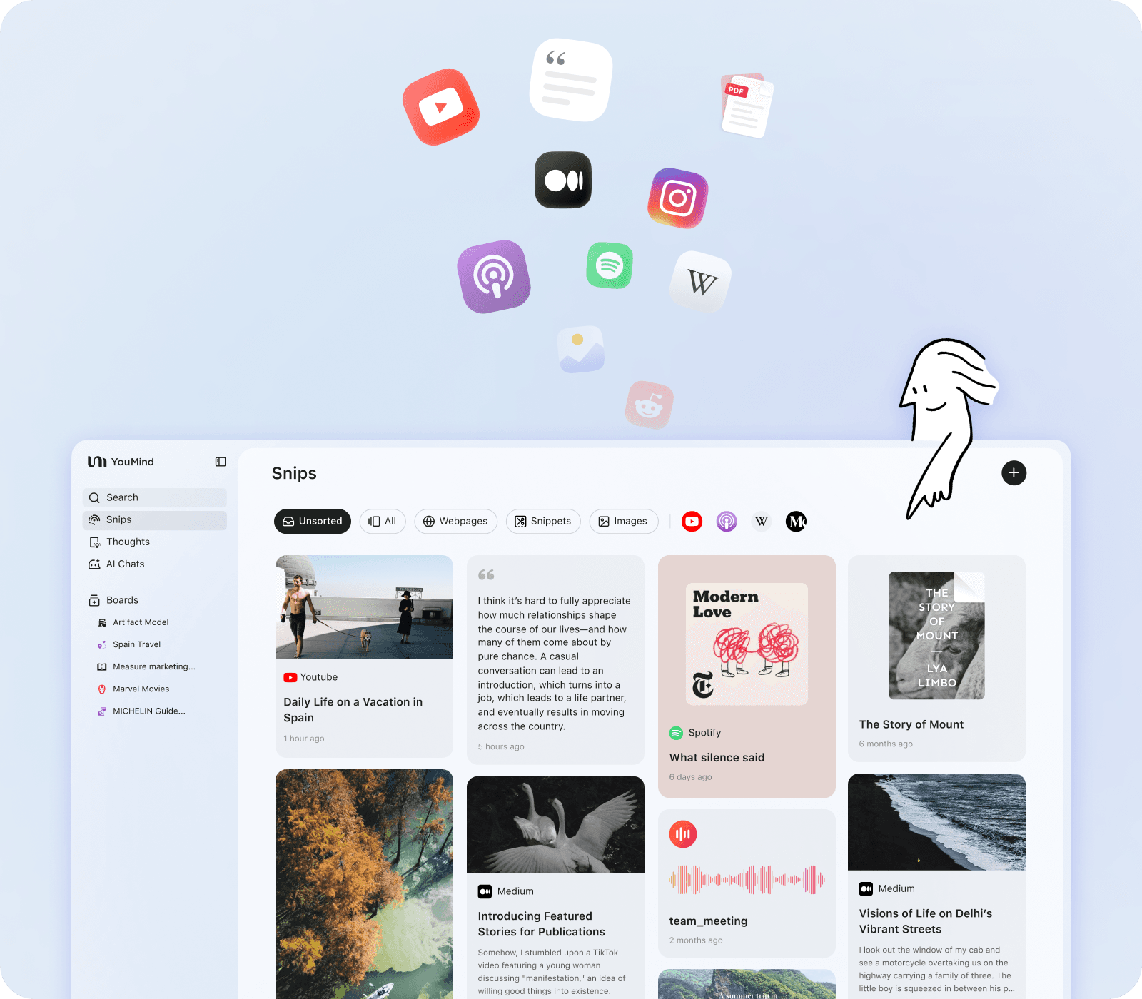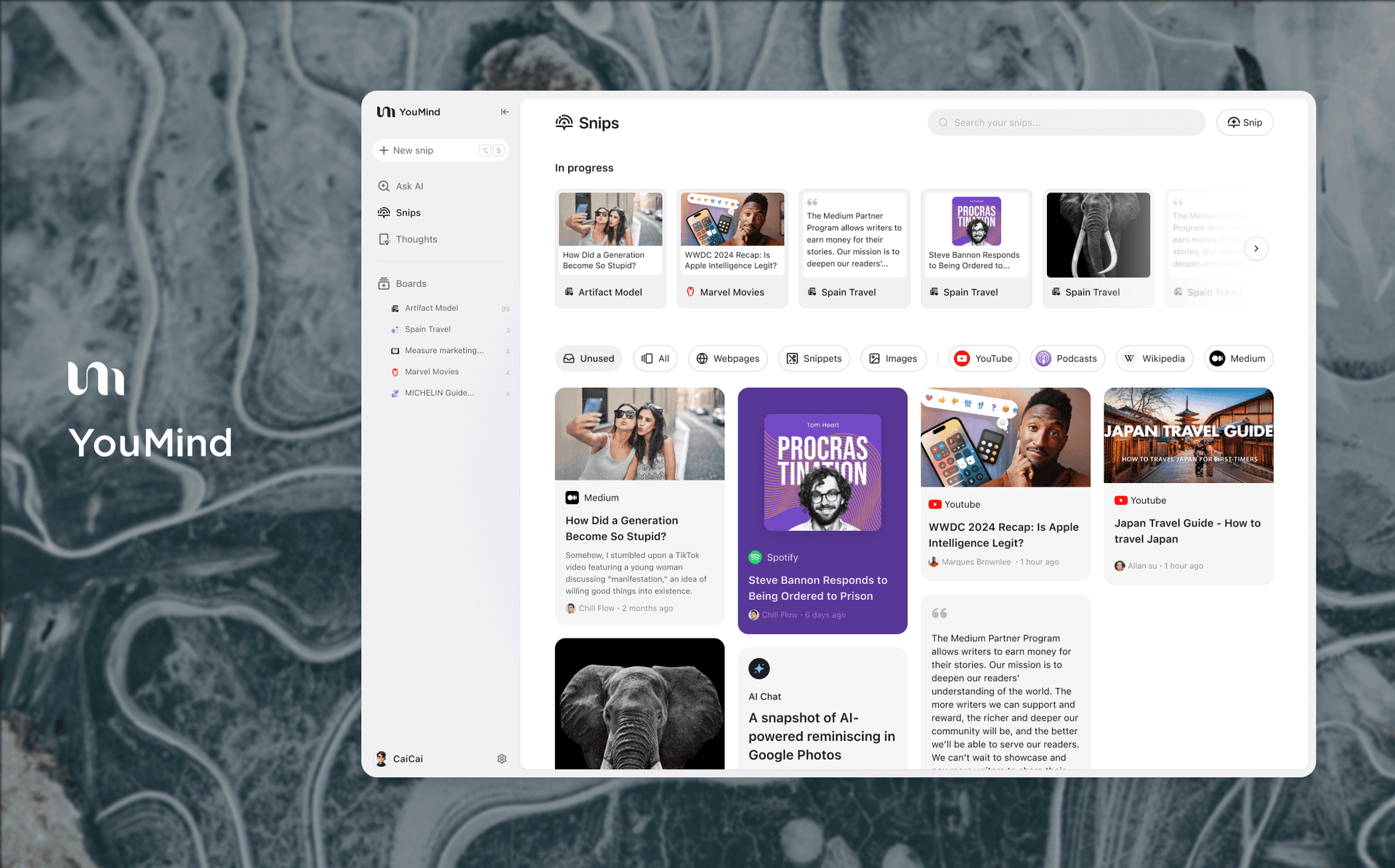 进入 YouMind 的网页上,我们也没有为收藏进来的内容提供传统的分组,而是创新性的推出了 “Board” 的功能,你可以将其理解这是一个独立的创作项目空间。 通过在此空间内收集素材,你可以进一步挖掘灵感、进行二次创作,甚至直接输出最终的成果,例如播客、视频等等