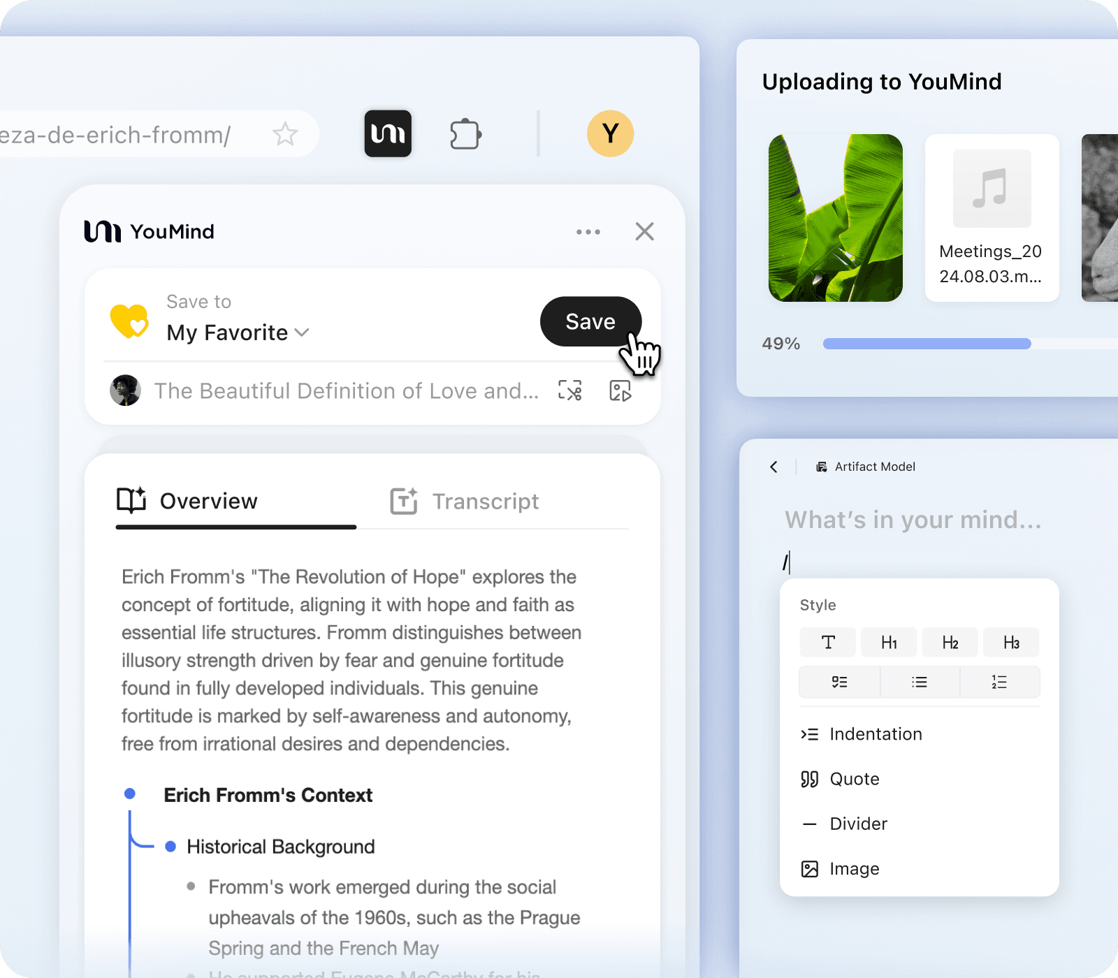 因此,今天的 YouMind 并非旨在解决“收藏”本身的问题,而是希望探寻“收藏”行为背后的 “为什么?” 我们尝试将这个“为什么”拆解融入到 YouMind 的各个环节之中。 例如,我们推出的浏览器插件,并非类似于 Readwise 这类单纯的存储工具,它不仅仅是存储,更重要的是在用户点击 “保存” 之前,提供一个简单的判断机制,帮助用户初步评估当前收集的内容是否与创作主题相关。 此外,我们还支持局部保存功能,小到一段文字、一张图片,我们都希望用户能够只保存真正有价值的内容到 YouMind,以便后续进行创作。